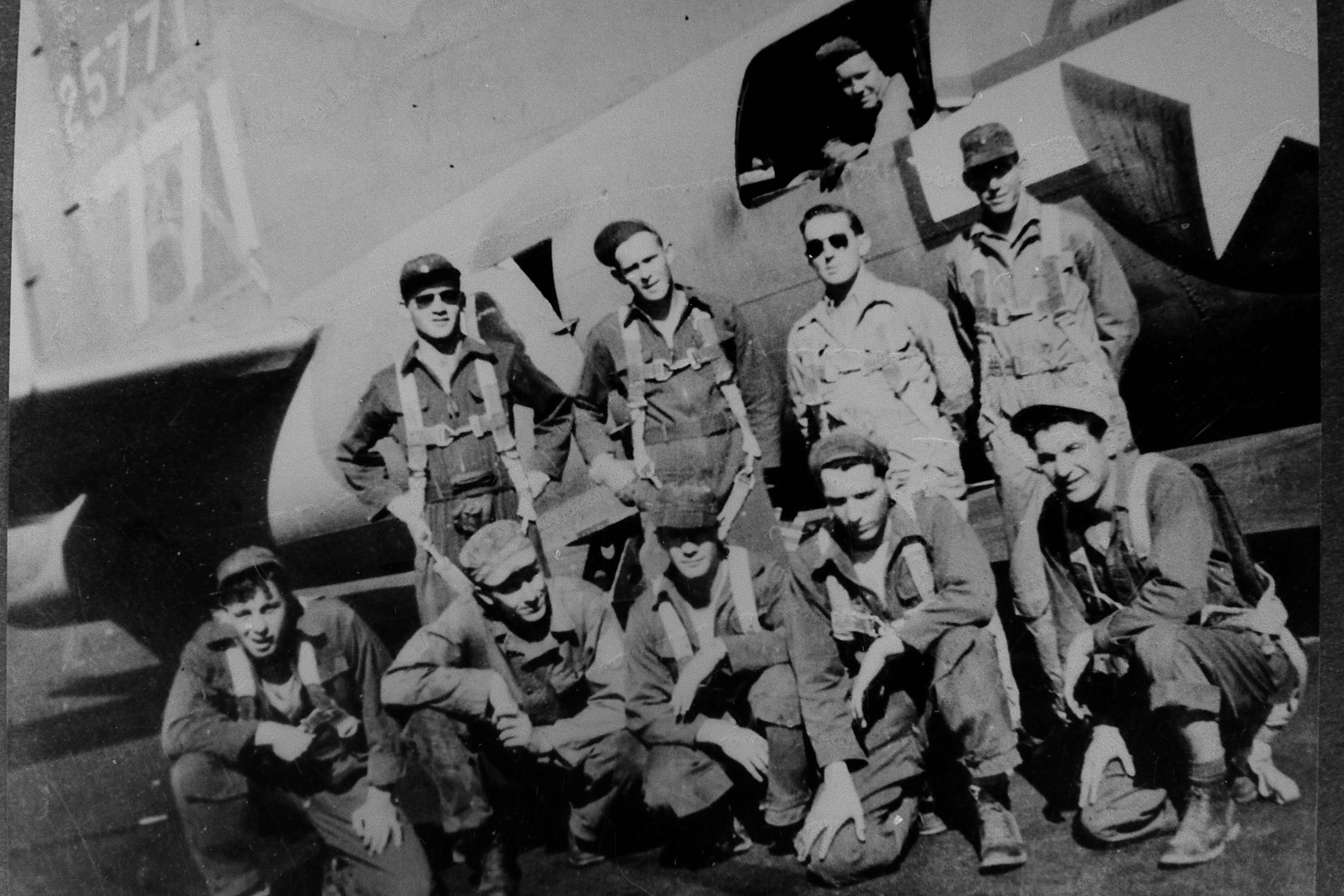Cathey Crew, 547th BS, of 43-37843 Alex SO*B at Biggs Field, El Paso; Back l-r: John Hinds (CP), George Cathey (P), William Hinshaw (N; later replaced by Morton Hertz), Kenneth Sparks (B); Front l-r: J. Roy (RO), Alfred Smith (TT), Roy LaRue (TG), David Duncan (BT), Frank Kalan (FG).