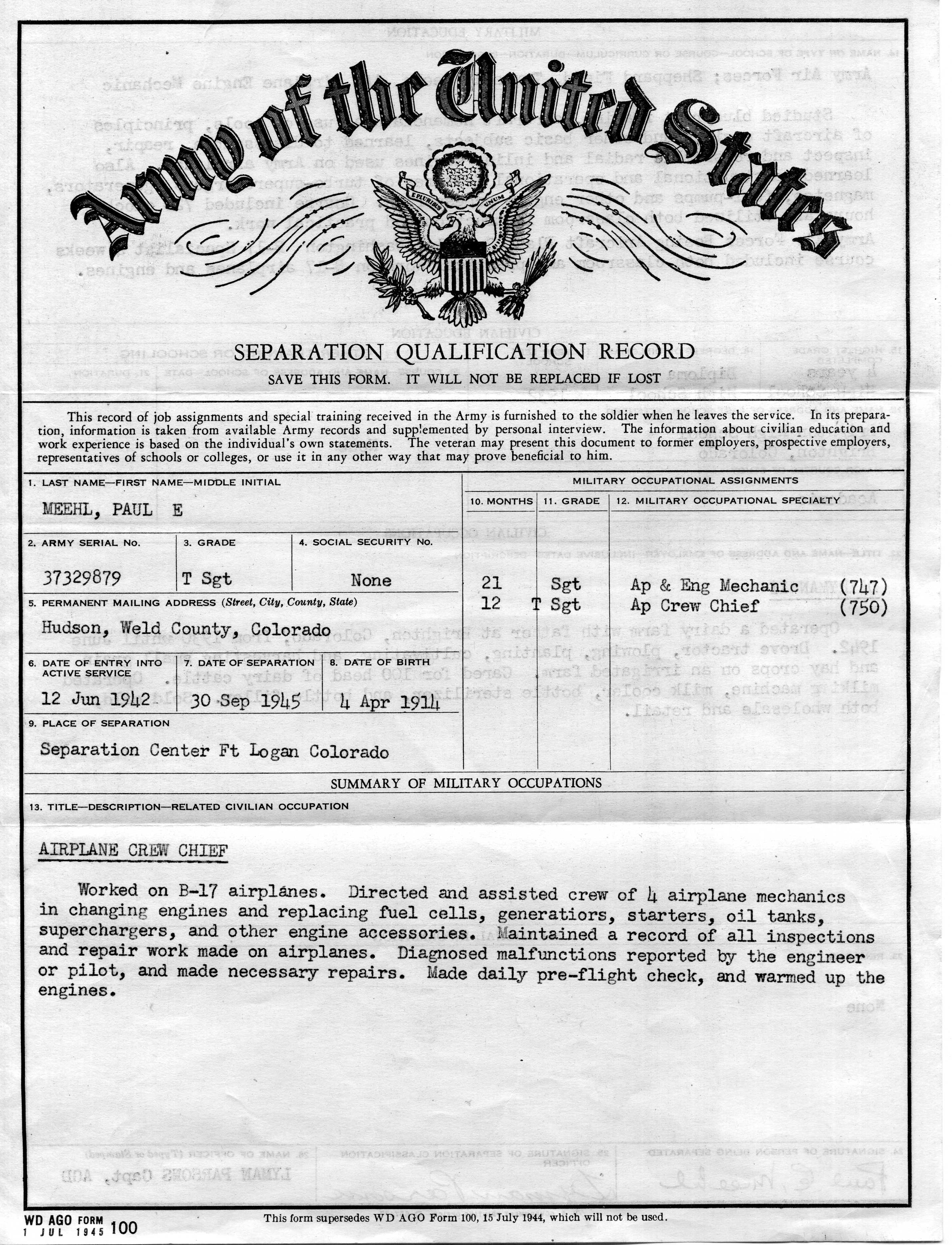 Separation Qualification Record (front and back) of my father, Paul Meehl, 547th BS groundcrew.