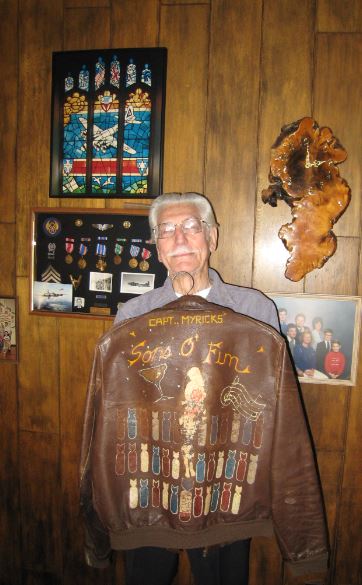 Don Brooks, gunner on the Ken Myrick Crew, displays his A-2 jacket, depicting "Captain Myrick's 'Sons O Fun' [wine] [women] [song]", and a load of missions!